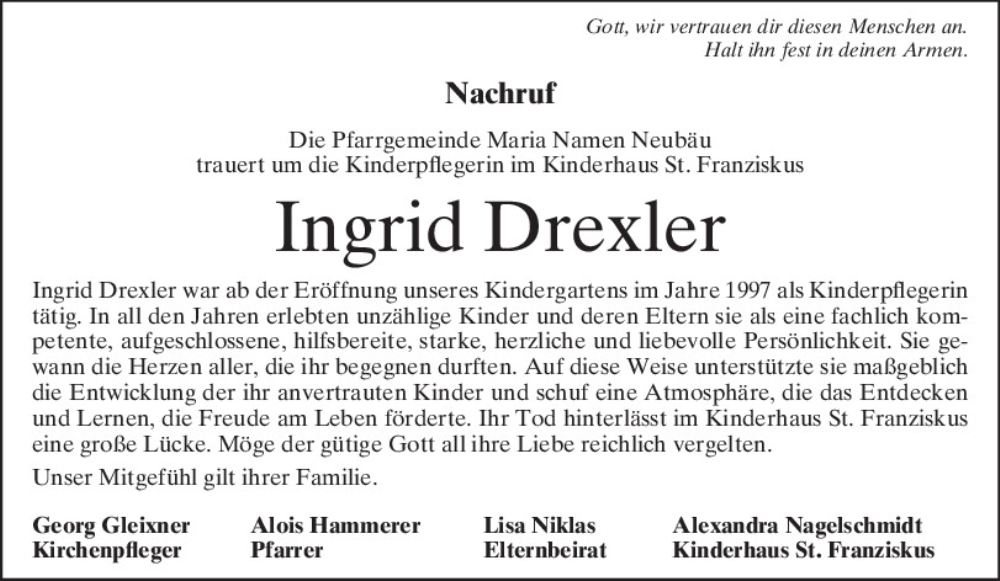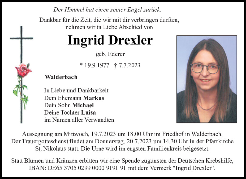 Hier finden Sie alle Traueranzeigen aus der Zeitung, die bisher für Ingrid Drexler erschienen sind.