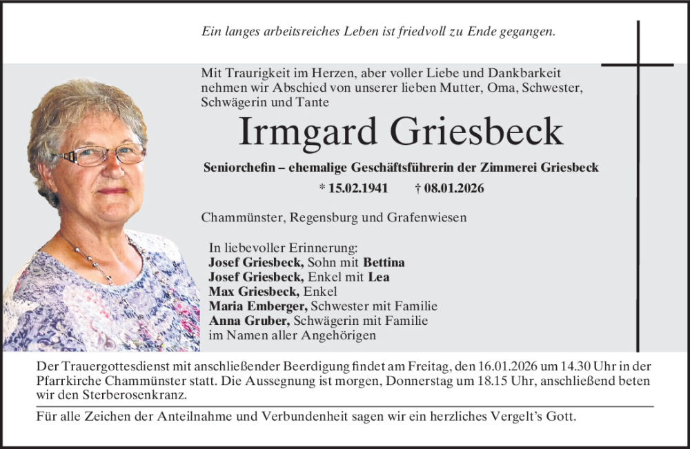 Hier finden Sie alle Traueranzeigen aus der Zeitung, die bisher für Irmgard Griesbeck erschienen sind.
