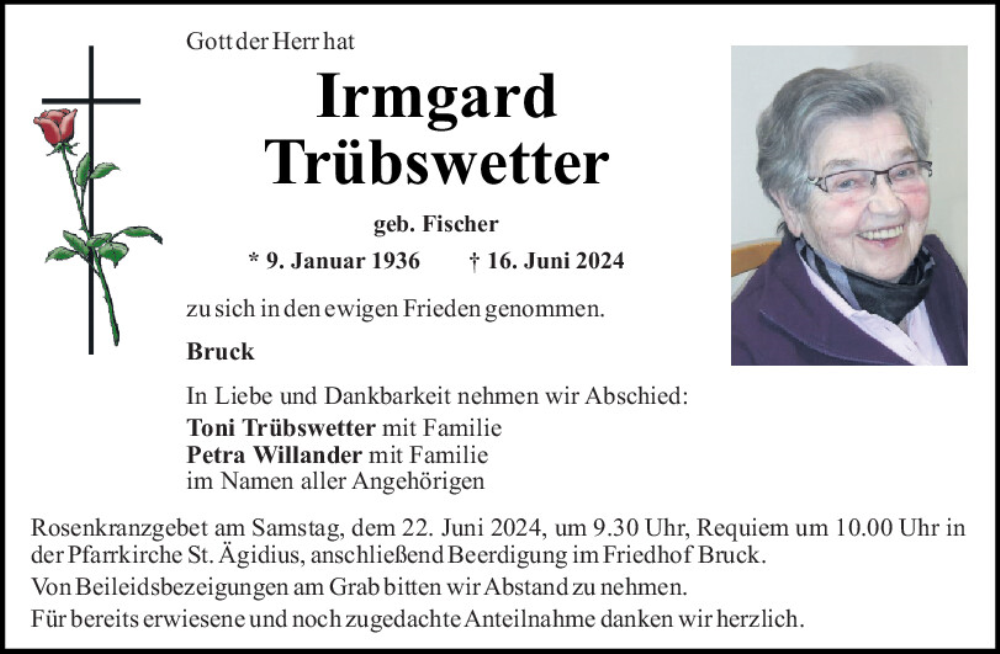 Hier finden Sie alle Traueranzeigen aus der Zeitung, die bisher für Irmgard Trübswetter erschienen sind.