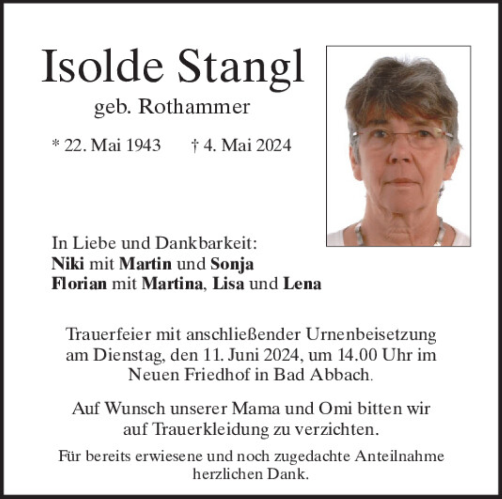 Hier finden Sie alle Traueranzeigen aus der Zeitung, die bisher für Isolde Stangl erschienen sind.