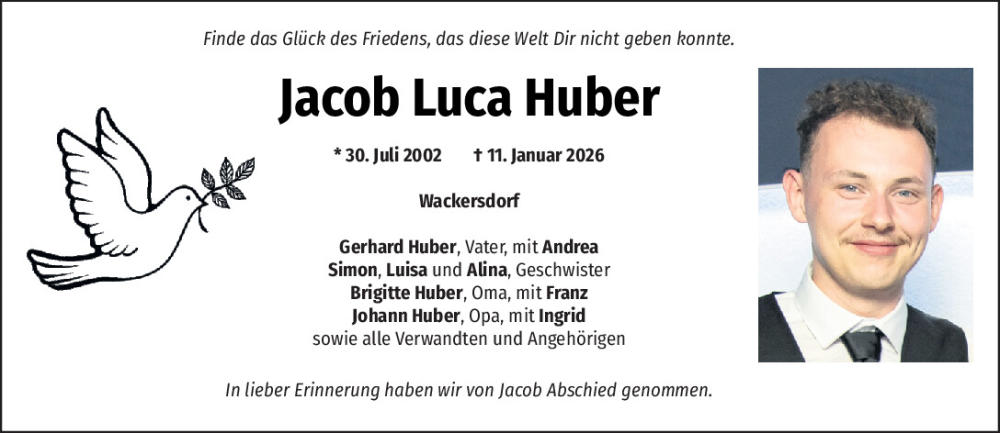 Hier finden Sie alle Traueranzeigen aus der Zeitung, die bisher für Jacob Luca Huber erschienen sind.