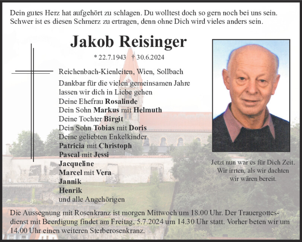 Hier finden Sie alle Traueranzeigen aus der Zeitung, die bisher für Jakob Reisinger erschienen sind.