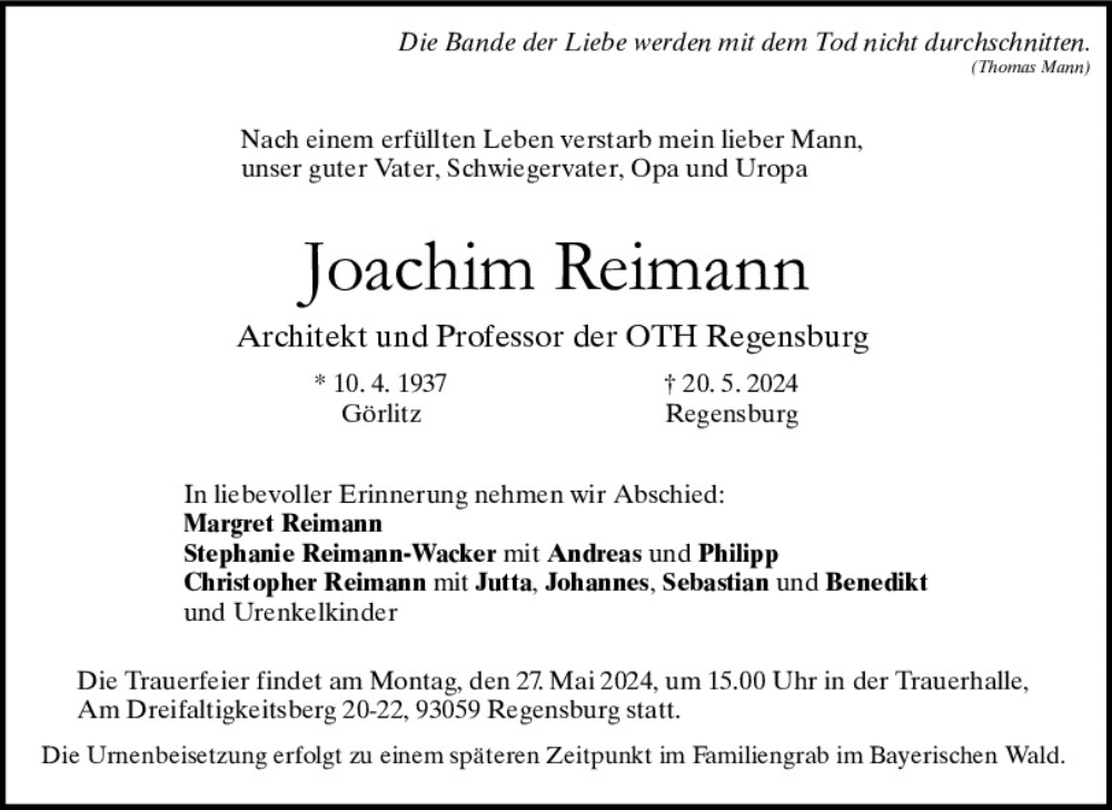 Hier finden Sie alle Traueranzeigen aus der Zeitung, die bisher für Joachim Reimann erschienen sind.