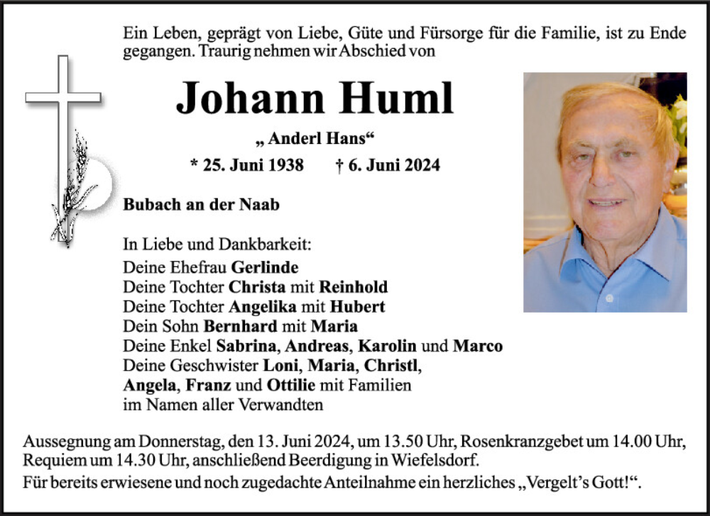 Hier finden Sie alle Traueranzeigen aus der Zeitung, die bisher für Johann Huml erschienen sind.