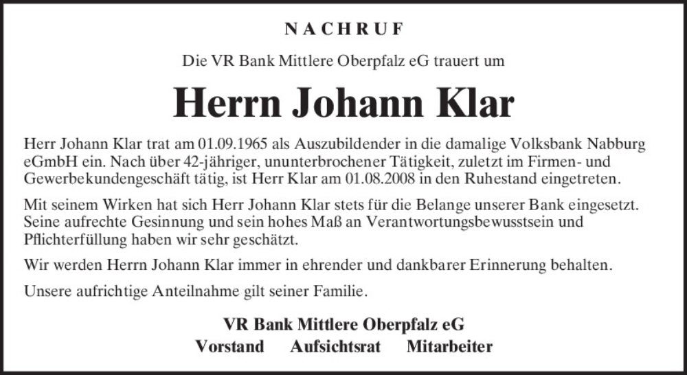 Hier finden Sie alle Traueranzeigen aus der Zeitung, die bisher für Johann Klar erschienen sind.