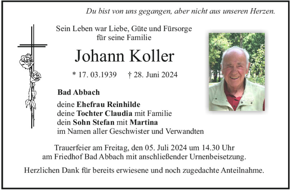 Hier finden Sie alle Traueranzeigen aus der Zeitung, die bisher für Johann Koller erschienen sind.