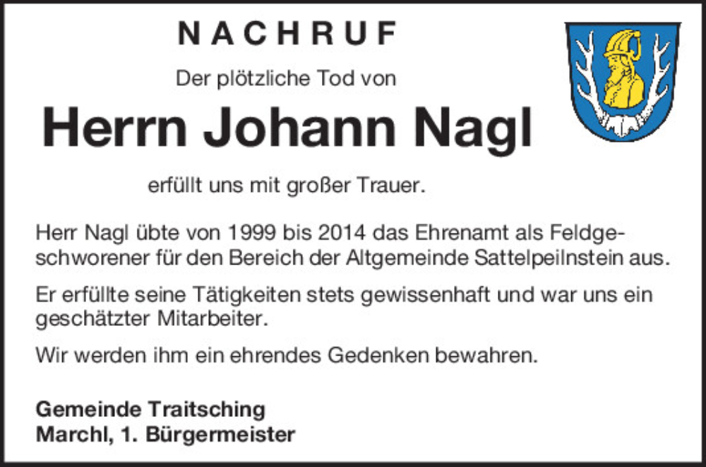 Hier finden Sie alle Traueranzeigen aus der Zeitung, die bisher für Johann Nagl erschienen sind.