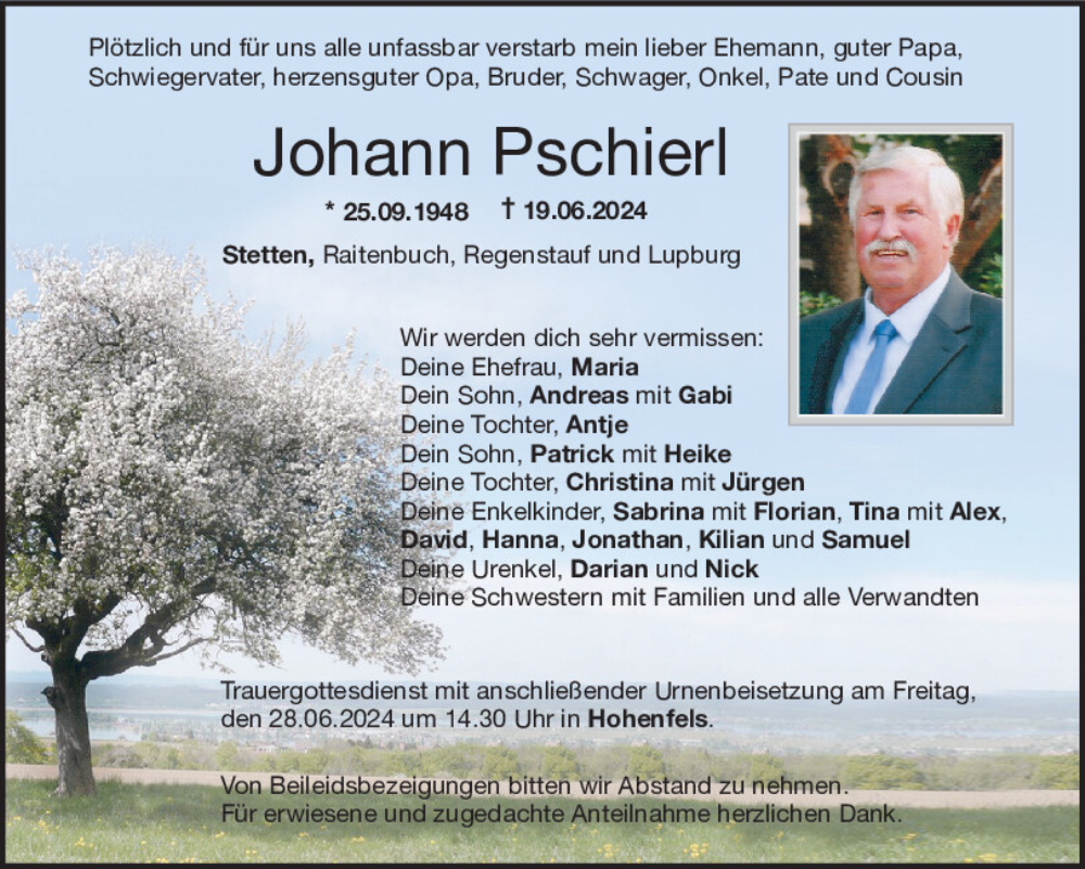 Hier finden Sie alle Traueranzeigen aus der Zeitung, die bisher für Johann Pschierl erschienen sind.