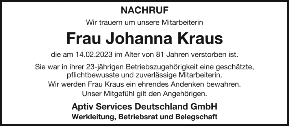 Hier finden Sie alle Traueranzeigen aus der Zeitung, die bisher für Johanna Kraus erschienen sind.
