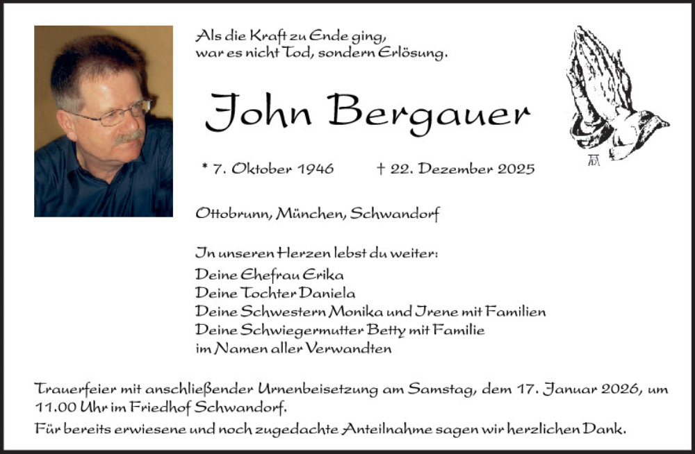 Hier finden Sie alle Traueranzeigen aus der Zeitung, die bisher für John Bergauer erschienen sind.