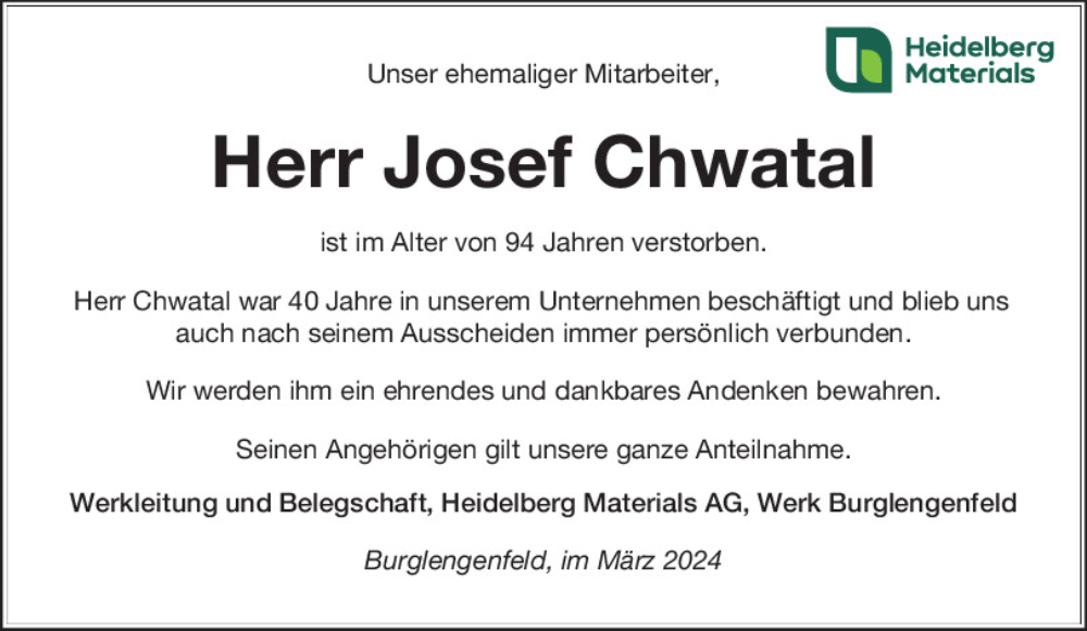 Hier finden Sie alle Traueranzeigen aus der Zeitung, die bisher für Josef Chwatal erschienen sind.