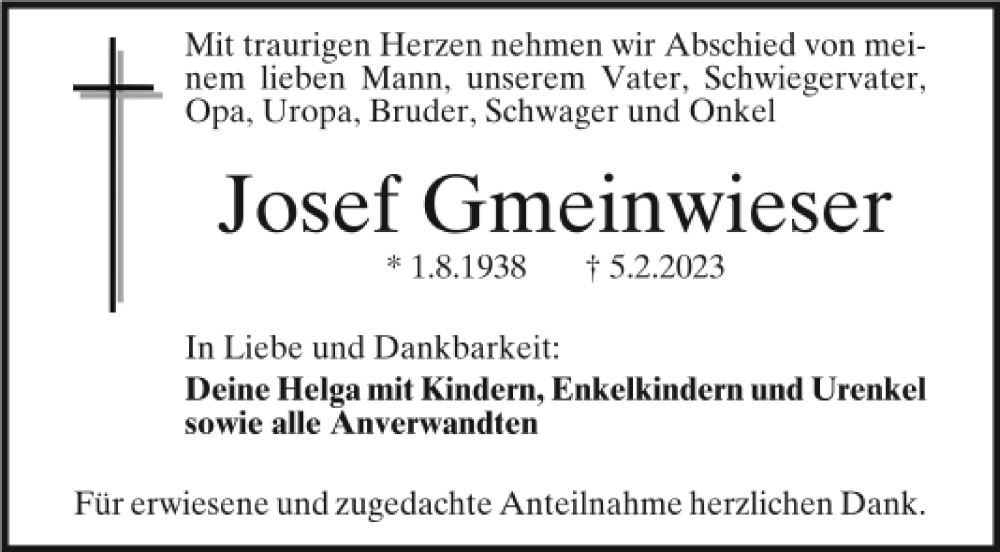 Hier finden Sie alle Traueranzeigen aus der Zeitung, die bisher für Josef Gmeinwieser erschienen sind.