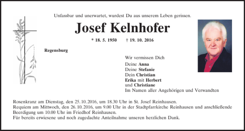 Hier finden Sie alle Traueranzeigen aus der Zeitung, die bisher für Josef Kelnhofer erschienen sind.