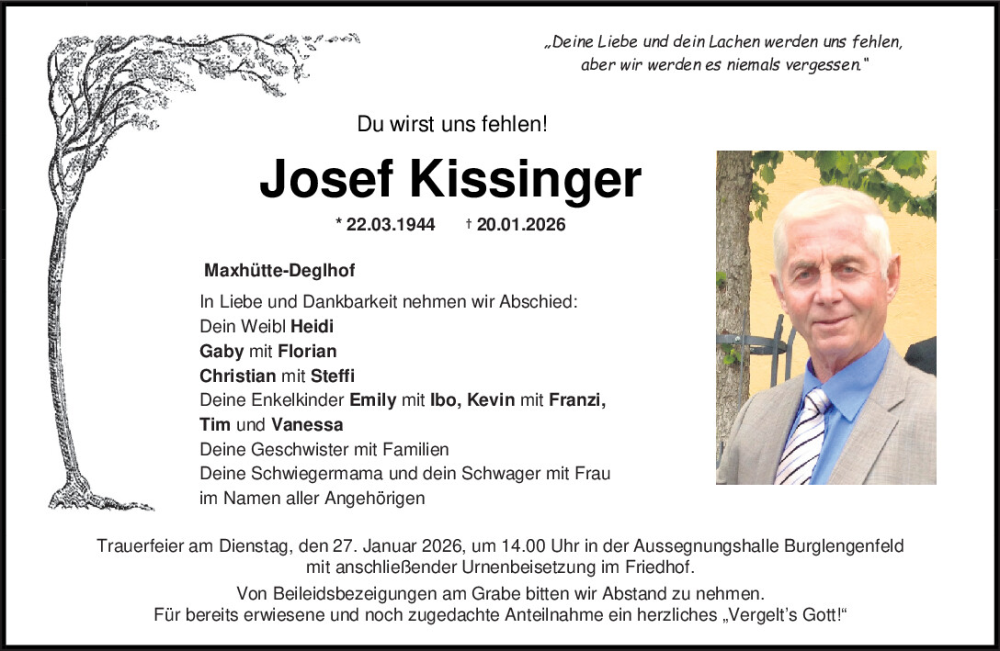 Hier finden Sie alle Traueranzeigen aus der Zeitung, die bisher für Josef Kissinger erschienen sind.