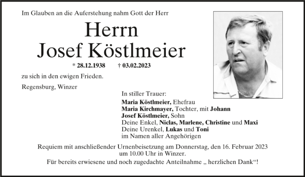 Hier finden Sie alle Traueranzeigen aus der Zeitung, die bisher für Josef Köstlmeier erschienen sind.