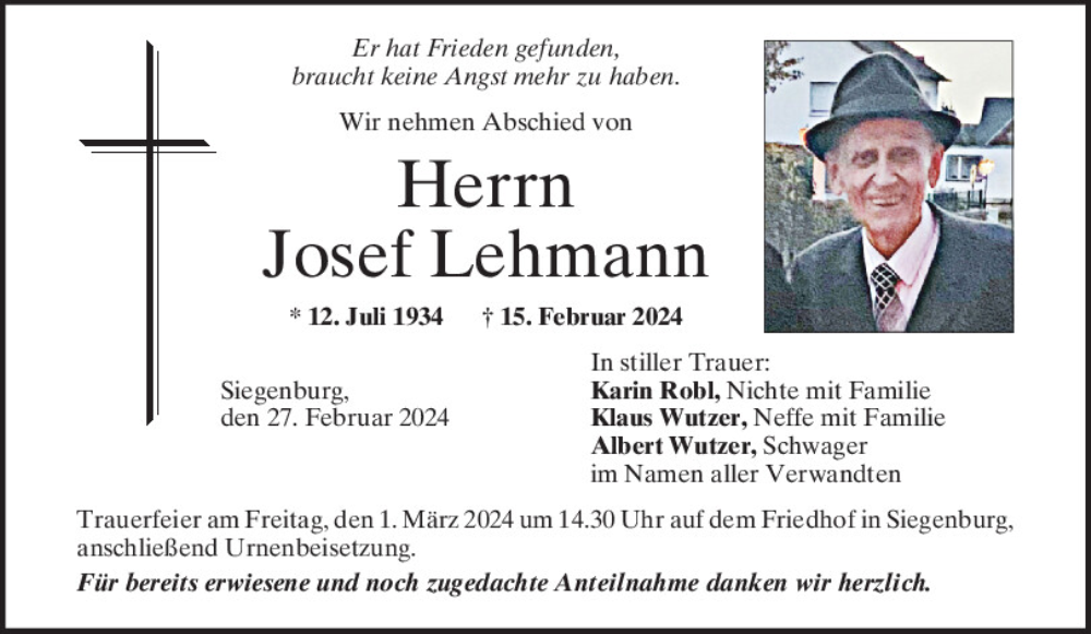 Hier finden Sie alle Traueranzeigen aus der Zeitung, die bisher für Josef Lehmann erschienen sind.