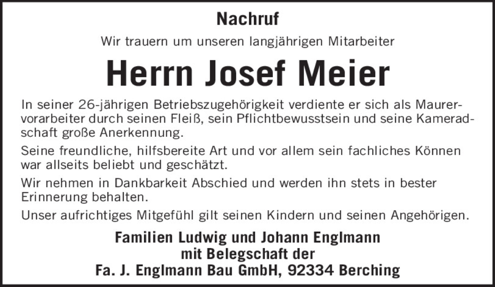 Hier finden Sie alle Traueranzeigen aus der Zeitung, die bisher für Josef Meier erschienen sind.