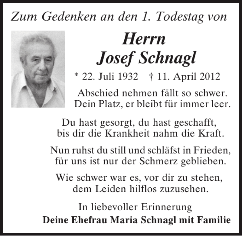 Hier finden Sie alle Traueranzeigen aus der Zeitung, die bisher für Josef Schnagl erschienen sind.