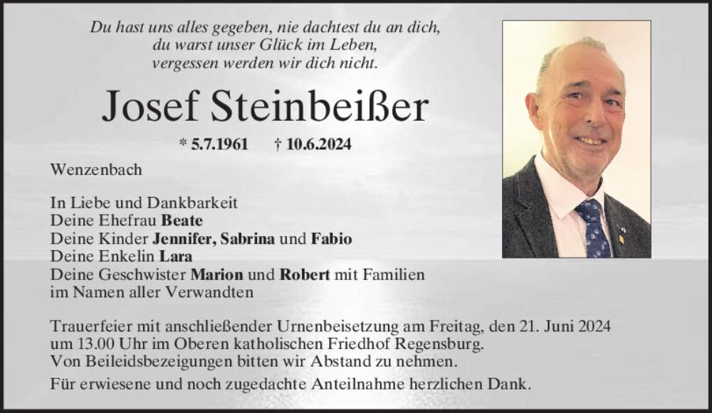 Hier finden Sie alle Traueranzeigen aus der Zeitung, die bisher für Josef Steinbeißer erschienen sind.