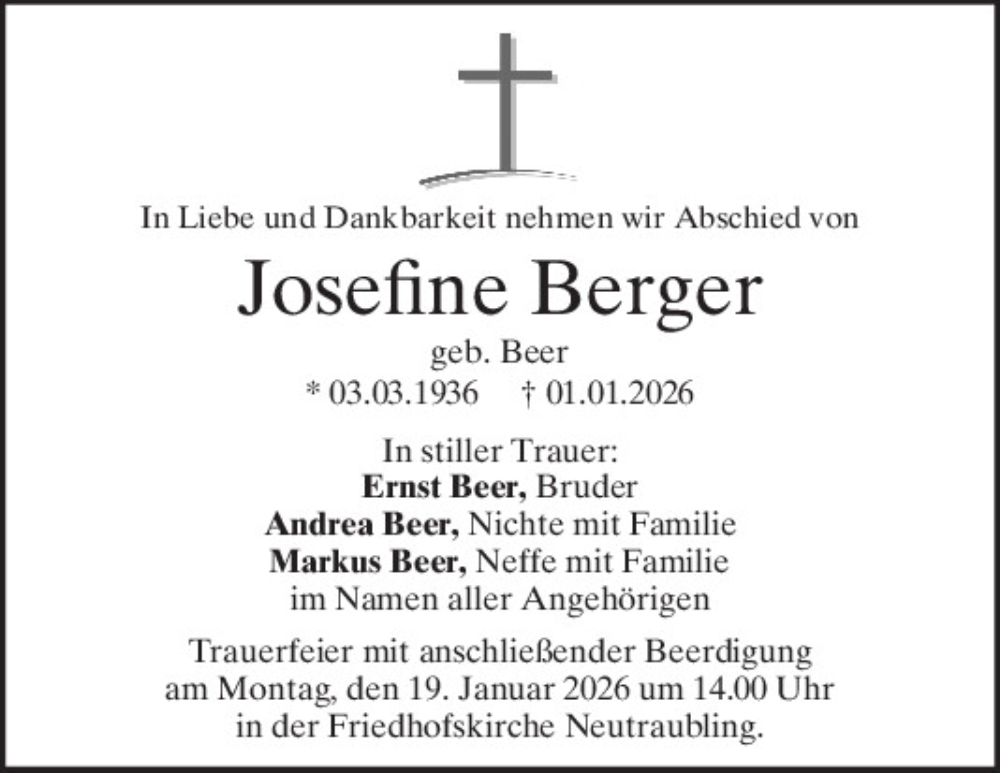 Hier finden Sie alle Traueranzeigen aus der Zeitung, die bisher für Josefine Berger erschienen sind.