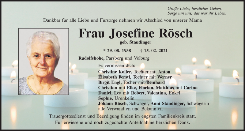 Hier finden Sie alle Traueranzeigen aus der Zeitung, die bisher für Josefine Rösch erschienen sind.