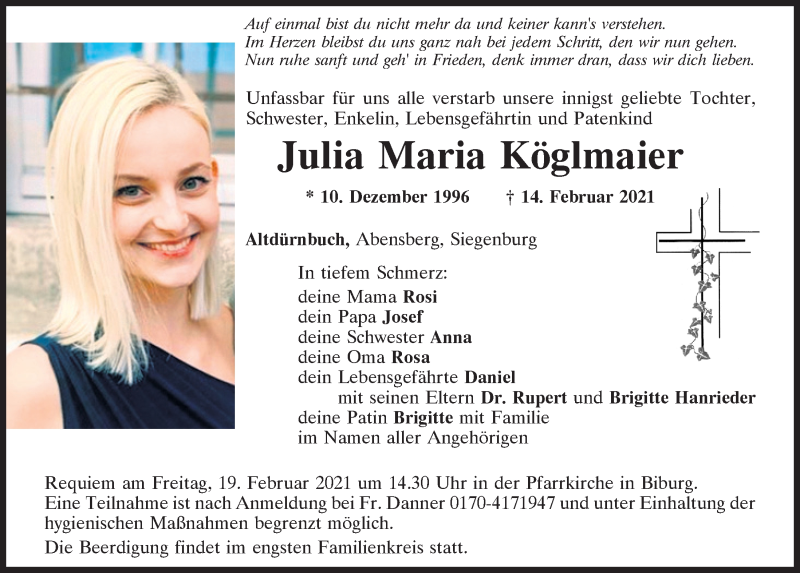 Hier finden Sie alle Traueranzeigen aus der Zeitung, die bisher für Julia Maria Köglmaier erschienen sind.