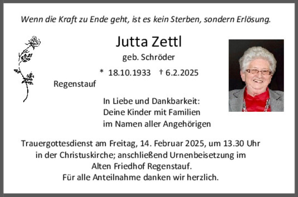 Hier finden Sie alle Traueranzeigen aus der Zeitung, die bisher für Jutta Zettl erschienen sind.