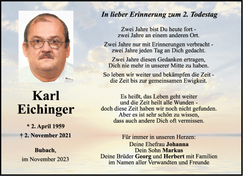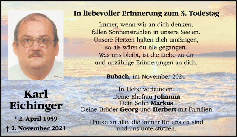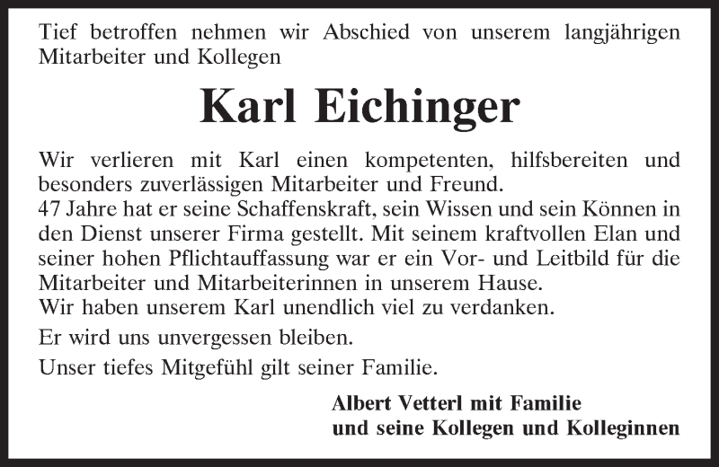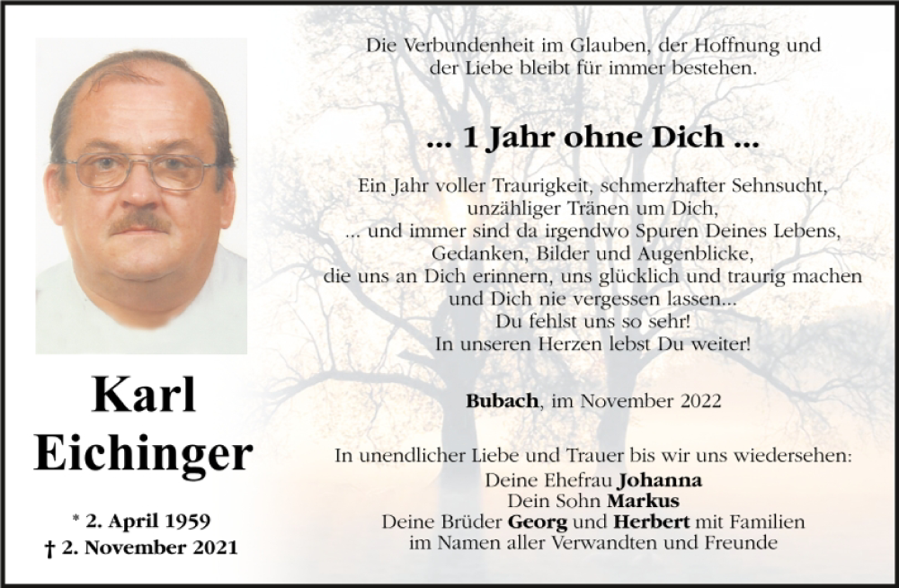 Hier finden Sie alle Traueranzeigen aus der Zeitung, die bisher für Karl Eichinger erschienen sind.