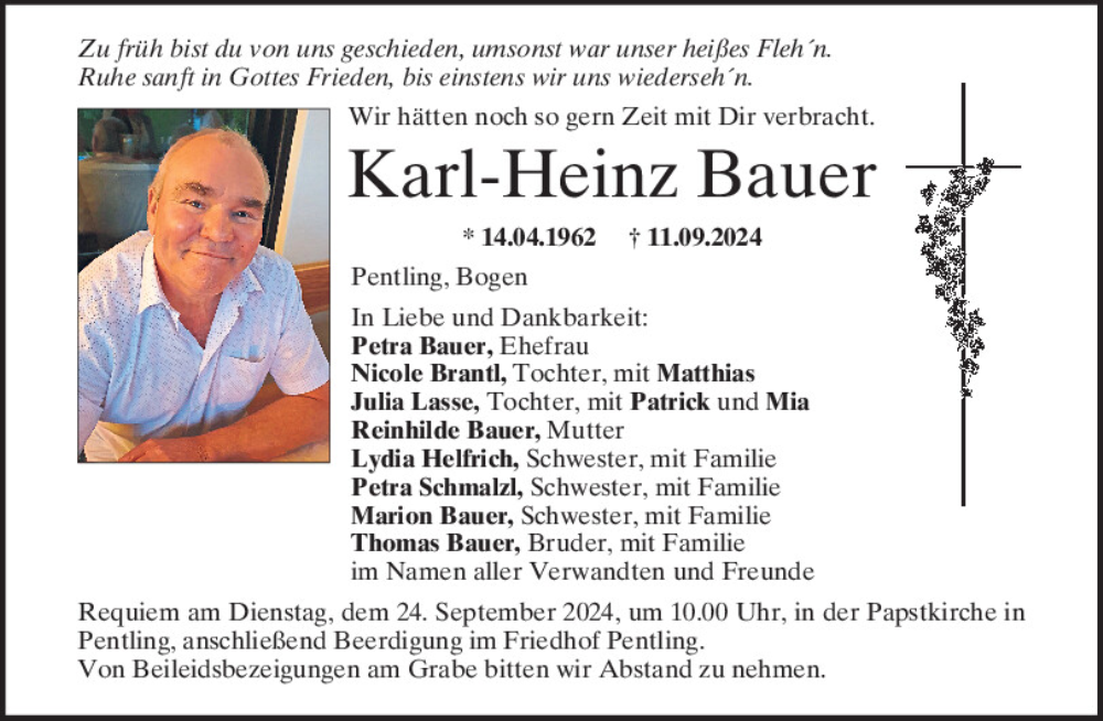 Hier finden Sie alle Traueranzeigen aus der Zeitung, die bisher für Karl-Heinz Bauer erschienen sind.