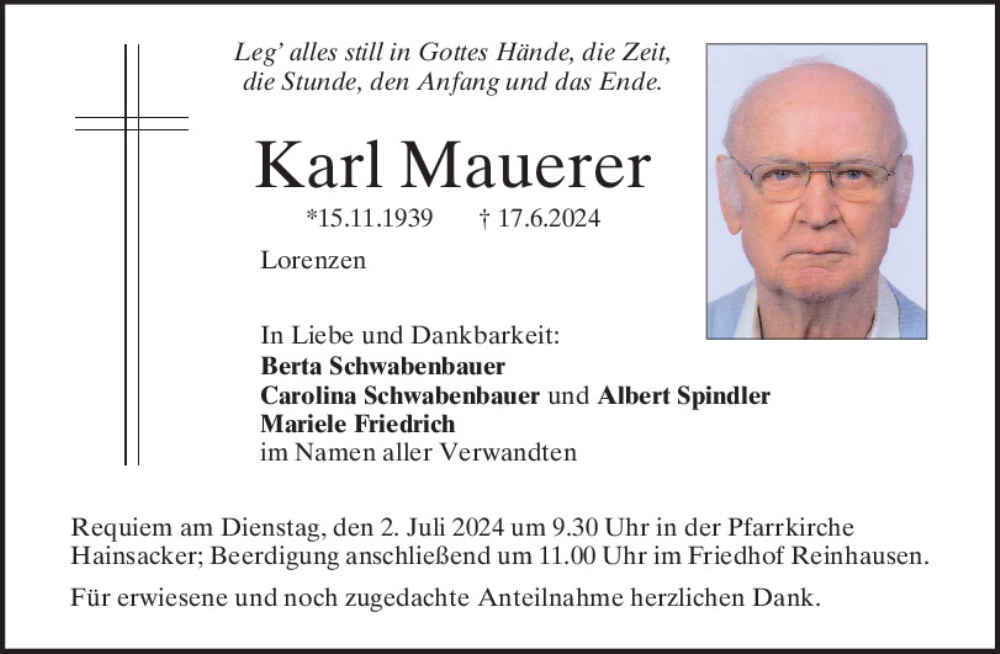 Hier finden Sie alle Traueranzeigen aus der Zeitung, die bisher für Karl Mauerer erschienen sind.