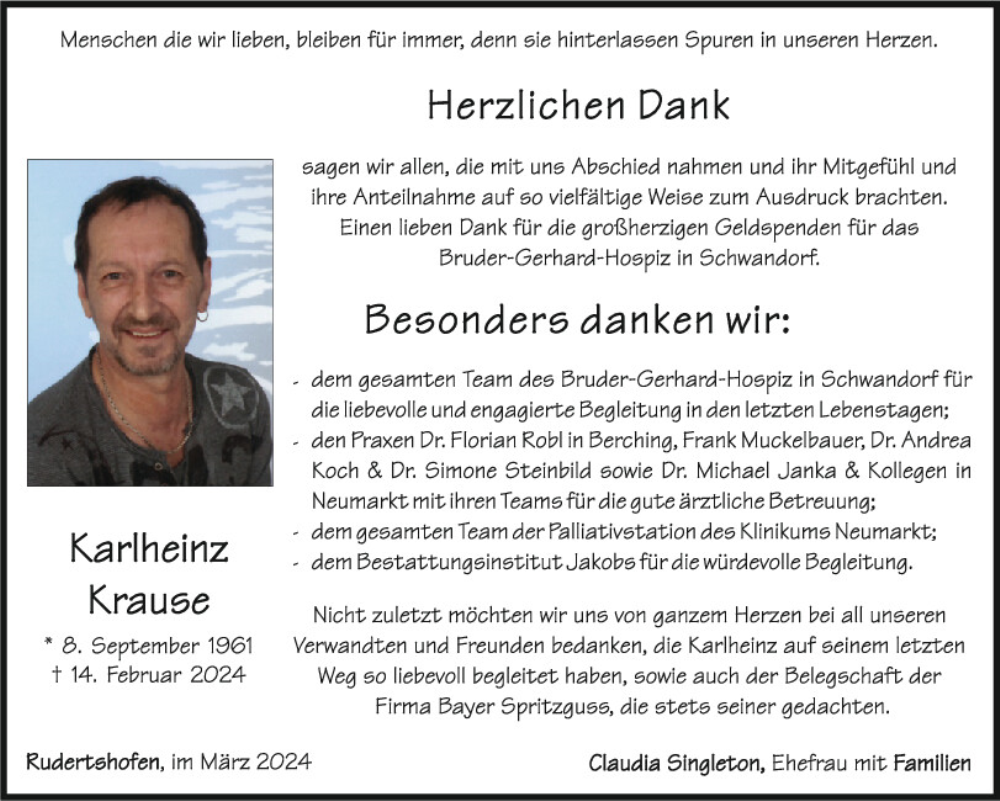 Hier finden Sie alle Traueranzeigen aus der Zeitung, die bisher für Karlheinz Krause erschienen sind.