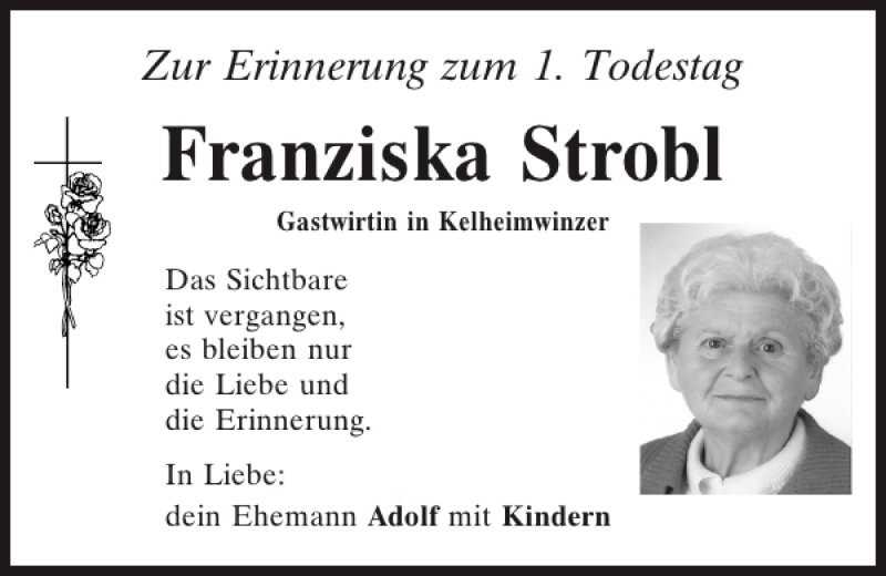 Hier finden Sie alle Traueranzeigen aus der Zeitung, die bisher für Kelheimwinzer Franziska Strobl erschienen sind.