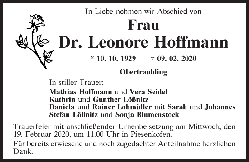 Hier finden Sie alle Traueranzeigen aus der Zeitung, die bisher für Leonore Hoffmann erschienen sind.