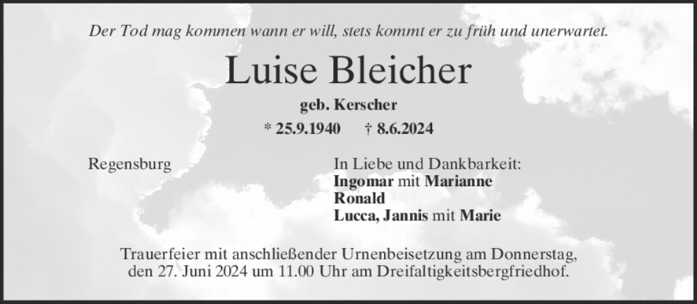 Hier finden Sie alle Traueranzeigen aus der Zeitung, die bisher für Luise Bleicher erschienen sind.