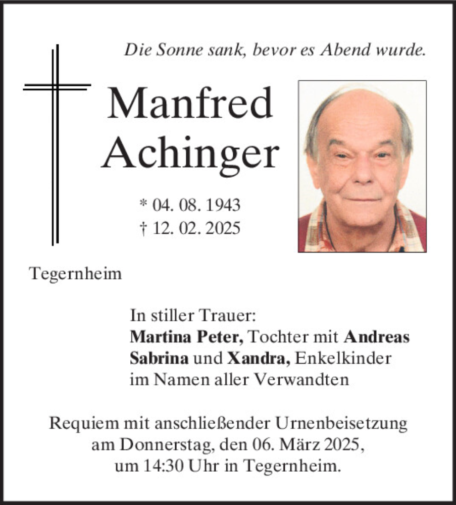 Hier finden Sie alle Traueranzeigen aus der Zeitung, die bisher für Manfred Achinger erschienen sind.