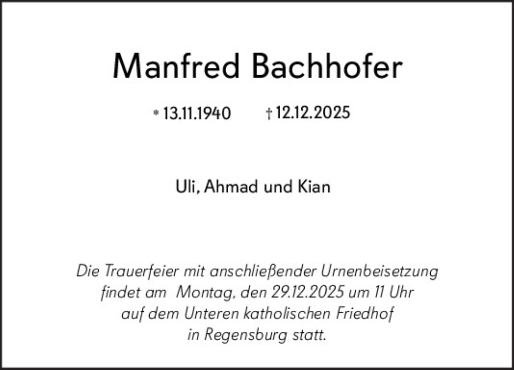 Hier finden Sie alle Traueranzeigen aus der Zeitung, die bisher für Manfred Bachhofer erschienen sind.