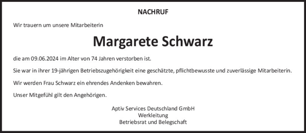 Hier finden Sie alle Traueranzeigen aus der Zeitung, die bisher für Margarete Schwarz erschienen sind.