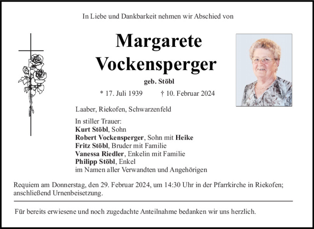 Hier finden Sie alle Traueranzeigen aus der Zeitung, die bisher für Margarete Vockensperger erschienen sind.