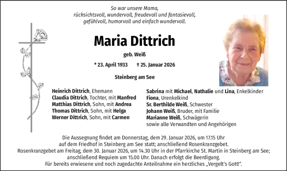 Hier finden Sie alle Traueranzeigen aus der Zeitung, die bisher für Maria Dittrich erschienen sind.