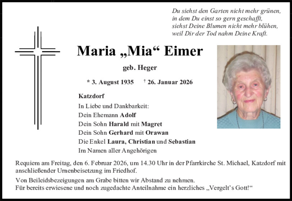 Hier finden Sie alle Traueranzeigen aus der Zeitung, die bisher für Maria Eimer erschienen sind.
