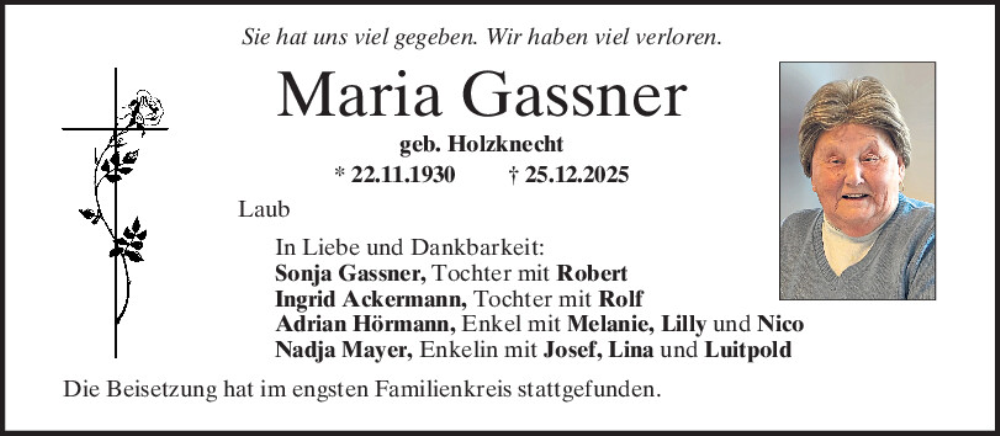 Hier finden Sie alle Traueranzeigen aus der Zeitung, die bisher für Maria Gassner erschienen sind.