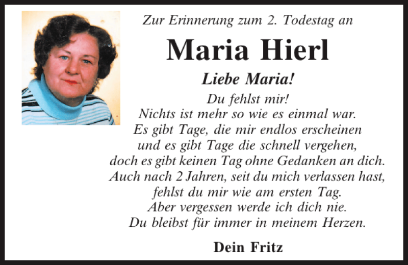 Hier finden Sie alle Traueranzeigen aus der Zeitung, die bisher für Maria Hierl erschienen sind.
