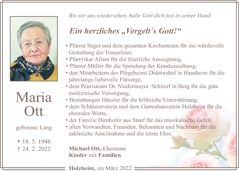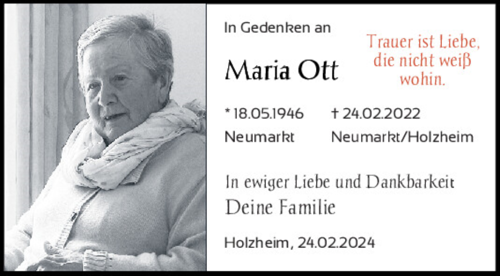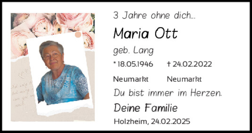 Hier finden Sie alle Traueranzeigen aus der Zeitung, die bisher für Maria Ott erschienen sind.