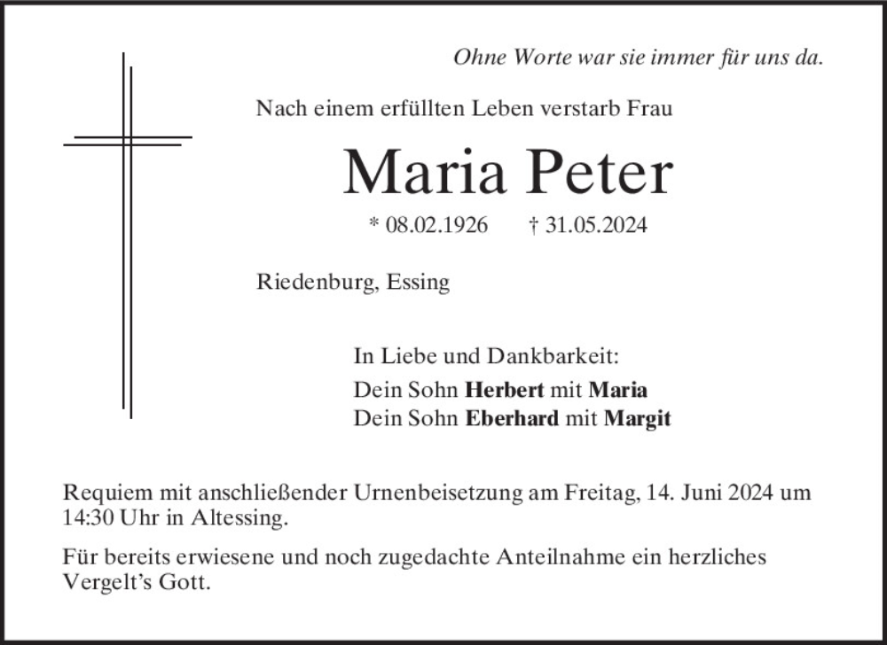 Hier finden Sie alle Traueranzeigen aus der Zeitung, die bisher für Maria Peter erschienen sind.