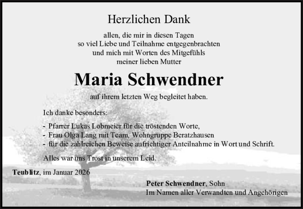 Hier finden Sie alle Traueranzeigen aus der Zeitung, die bisher für Maria Schwendner erschienen sind.