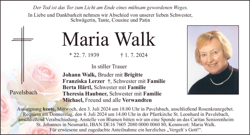 Hier finden Sie alle Traueranzeigen aus der Zeitung, die bisher für Maria Walk erschienen sind.