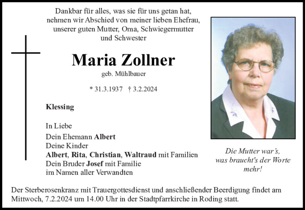Hier finden Sie alle Traueranzeigen aus der Zeitung, die bisher für Maria Zollner erschienen sind.