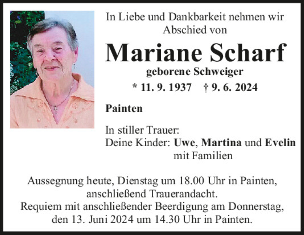 Hier finden Sie alle Traueranzeigen aus der Zeitung, die bisher für Mariane Scharf erschienen sind.