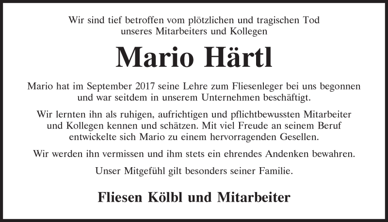 Hier finden Sie alle Traueranzeigen aus der Zeitung, die bisher für Mario Härtl erschienen sind.