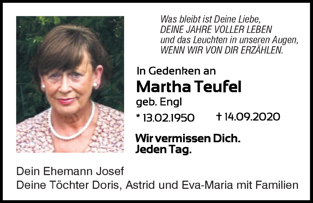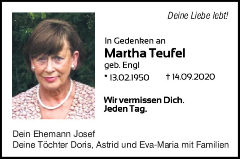 Hier finden Sie alle Traueranzeigen aus der Zeitung, die bisher für Martha Teufel erschienen sind.